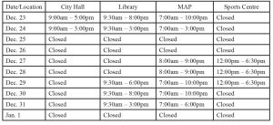The City would like to remind residents of our adjusted facility hours for the Holiday season. Regular facility hours will resume on January 2nd, 2026.