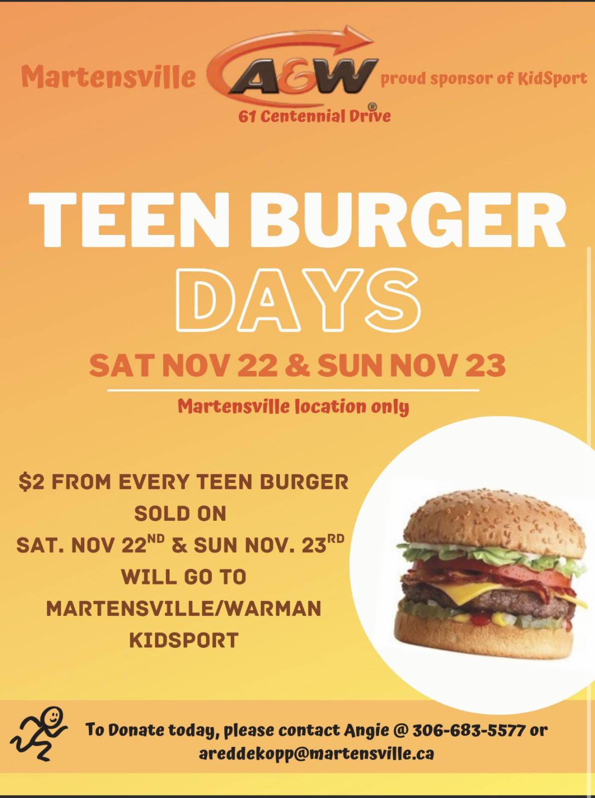 On Saturday, November 22nd and Sunday, November 23rd, $2.00 from every Teen Burger sold will go towards supporting Martensville/Warman KidSport.