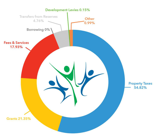 The City of Martensville collects the majority of its revenue through property taxes, with other revenue streams helping to fund infrastructure, programs, and services offered. Another significant source of revenue is government grant funding at 21.35%, however this funding has been declining in recent years. Revenues from fees and services comprise 17.93% of the City’s revenue stream. Examples include recreation programming user fees, garbage & recycling program fees, facility rental fees and others. The City continues to look for alternative funding opportunities to ensure we can maintain and grow all that the City offers.