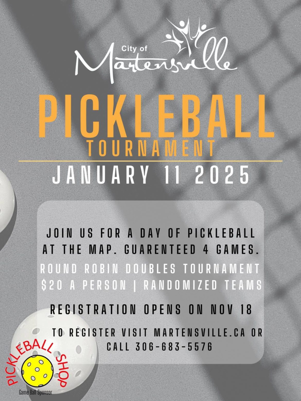 The Martensville Pickleball Tournament will be taking place on January 11th at the Martensville Athletic Pavilion.