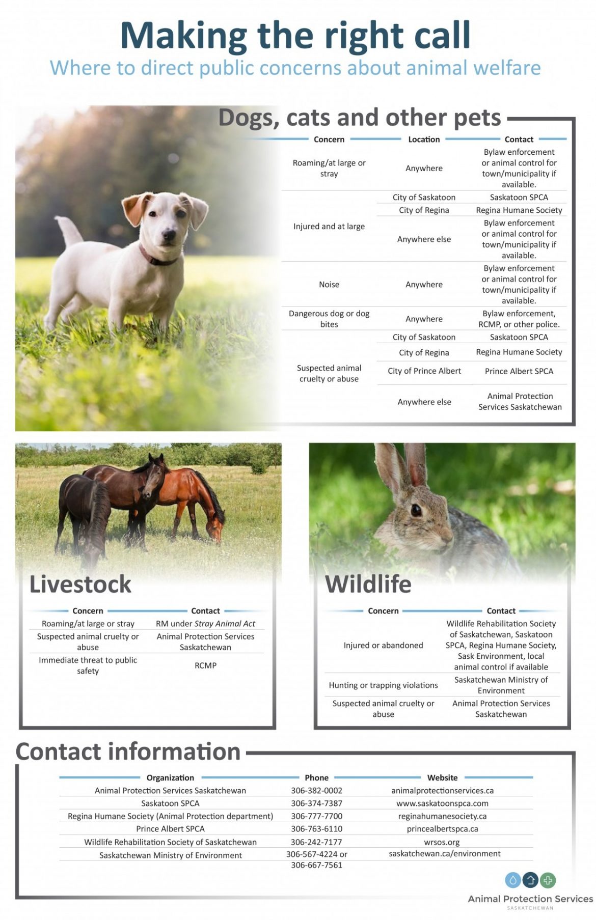 For more information about the Animal Protection Act, visit https://animalprotectionservices.ca/, or call 306-382-0002 or Toll Free 1-844-382-0002. Reports can be made anonomously by phone between the hours of 8am-5pm. After hours calls should be made to the local RCMP detachment.