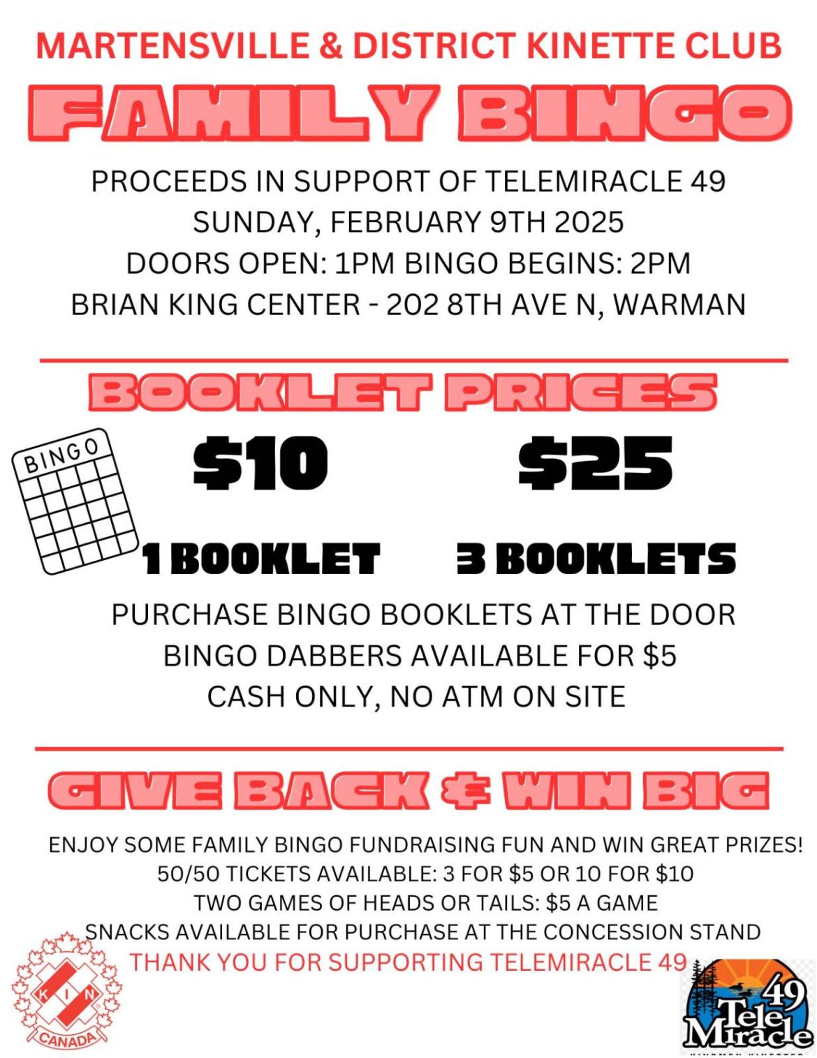 The Martensville & District Kinette Club is always finding new ways to help support TeleMiracle, and this weekend, they are hosting what is sure to be a fantastic event – Family Bingo!