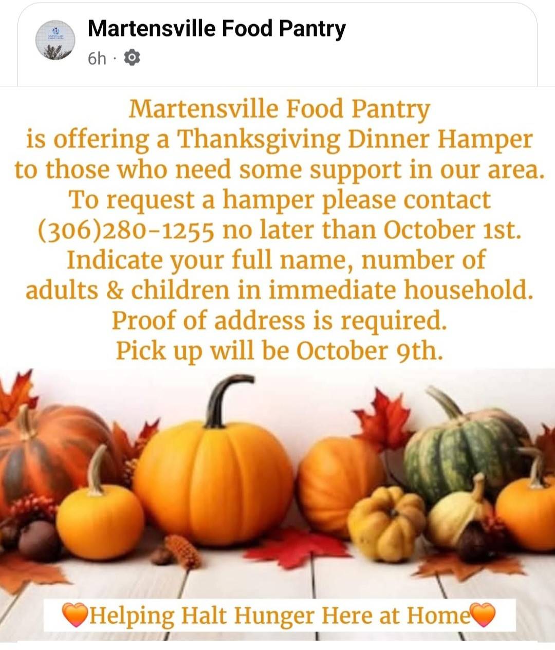 Hampers can be requested by contacting the MFP at (306) 280-1255, martensvillefoodpantry@gmail.com or message ‘Martensville Food Pantry’ on Facebook.