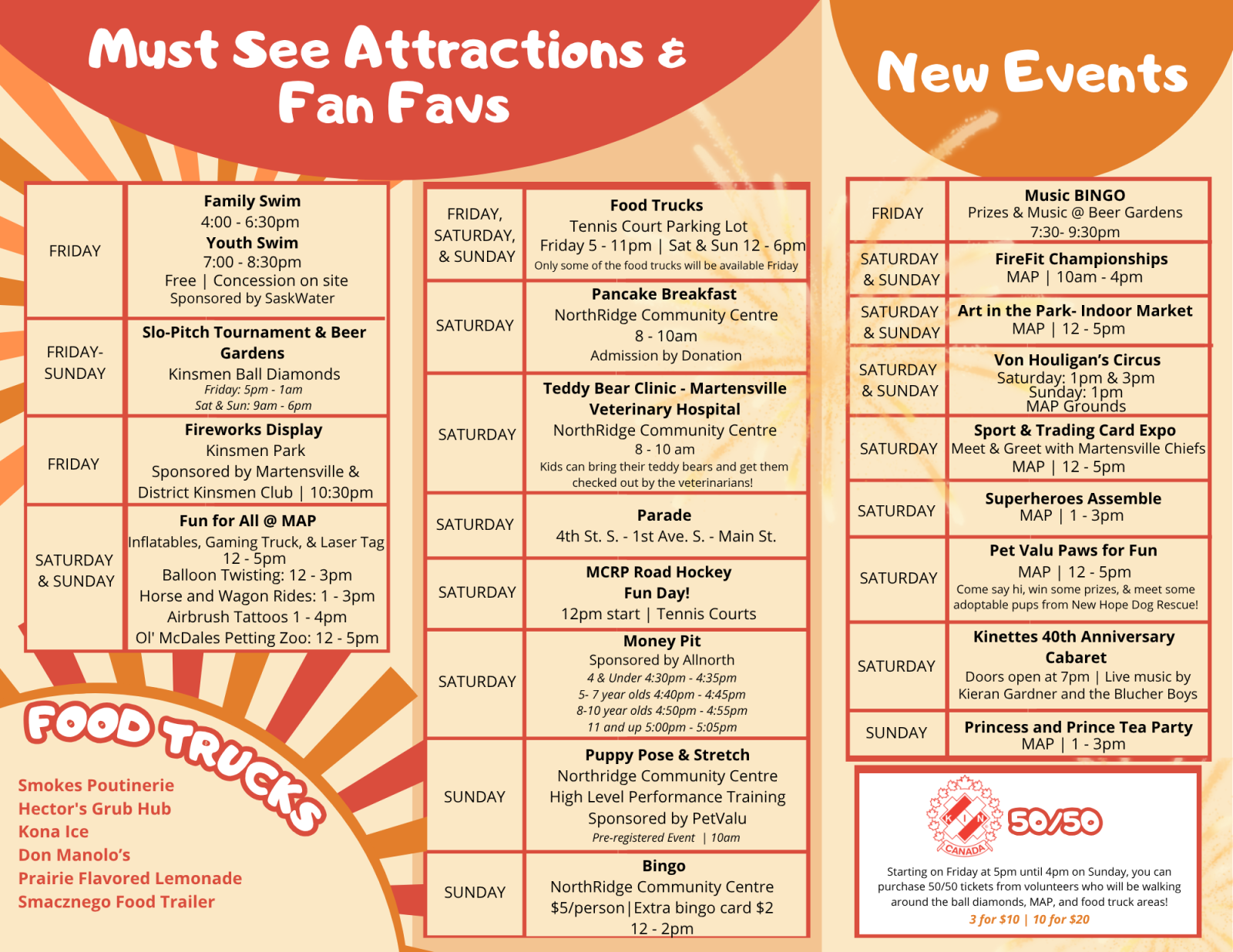 This event is made possible due to the contributions of numerous sponsors, including: City of Martensville, SaskLotteries, Martensville & District Kinsmen Club, Freeway Delivery Service Ltd, Saskatoon Fire & Flood, Affinity Credit Union, SaskTel, SaskEnergy, SaskWater, JP Massage Therapy, Allnorth, Co-op, Pet Valu Martensville, Geransky Bros Construction, and Express It More.
