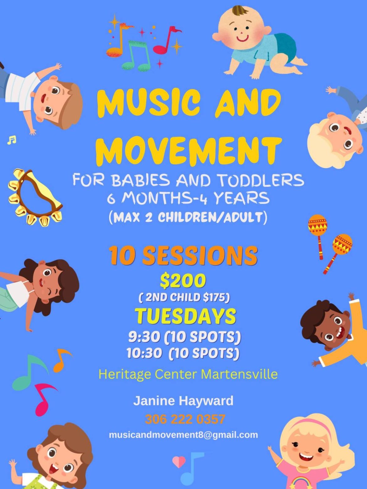 Details – Classes are Tuesday mornings either 9:30-10:30, or 10:30 to 11:30 at the Martensville Heritage Center. There are 10 sessions offered for 200.00 for 1 child and an additional child is 175.00. If the full-time sessions are not full, I will offer drop-ins for 25.00 a class. Please, no food but water bottles are welcomed. Indoor shoes required. Funds can be e-transferred to musicandmovement8@gmail.com . Classes start on Oct. 1. There is no class Oct. 22 because of the election. Classes are Oct. 1, 8, 15, 29, Nov. 5, 12, 19, 25 Dec. 3, 10.