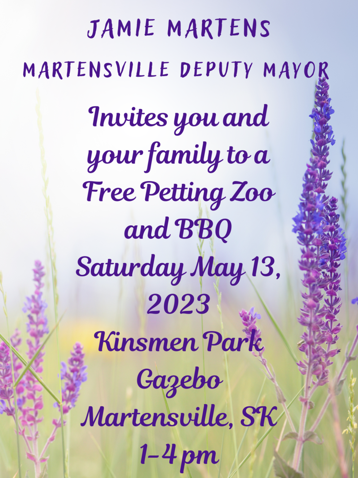 On Saturday, May13th from 1pm-4pm, Martensville’s Deputy Mayor Jamie Martens will be hosting a free event for Martensville and surrounding area residents to attend. This event will include a miniature petting zoo, a BBQ and face painting and will take place in Martensville’s Kinsmen Park by the gazebo.