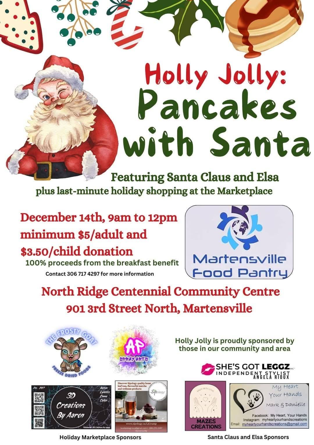 Holly Jolly: Pancakes with Santa will take place at the North Ridge Community Centre on Saturday, December 14th from 9am to 12pm, with proceeds from this event going towards supporting the Martensville Food Pantry.